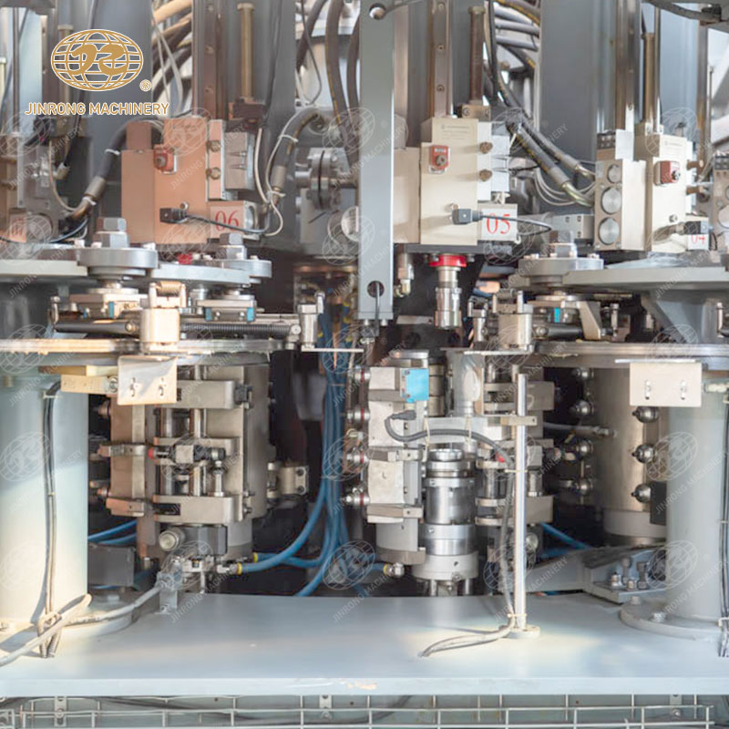全自动旋转式吹瓶机,有进坯斗、上料机构、 理坯机构、下料机构、进坯盘、加热器、出坯盘组成的加热系统,由合模机构、拉伸气缸、封口气缸组成的拉吹机。吹瓶设备特征在于所述的加热系统和拉吹机安装在同一台机座上,电箱安装在机座内的右后角,进坯斗、上料机构、 理坯机构、下料机构安置在电箱和加热器之间。拉吹机是四个工位,在四个工位的拉吹机旁安装一个取坯夹手机构和一个取瓶夹手机构,在取坯夹手机构和取瓶夹手机构中分别有两个取坯机械手和两个取瓶机械手。实用新型旋转式吹瓶机,布局非常紧凑,节约了占用空间,缩短了传递间距,大大降低成本,并且整机为一整体,吊装、运输时无需拆分。