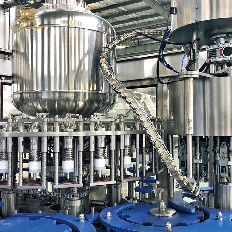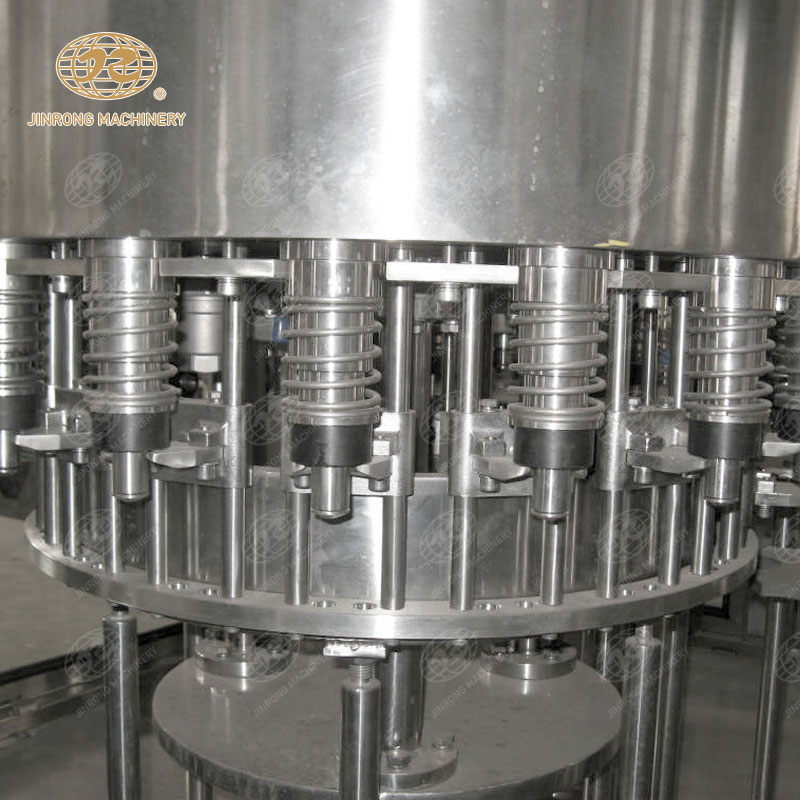 进入小瓶水加工生产设备的瓶子由瓶颈托板卡住并在凸轮作用下将瓶子上升,然后由瓶口将灌装阀顶开。灌装采用重力灌装方式。灌装阀打开后物料通过灌装阀完成灌装过程,灌装结束后瓶口下降离开灌装阀,瓶子通过卡瓶颈过渡拨轮进入旋盖机。