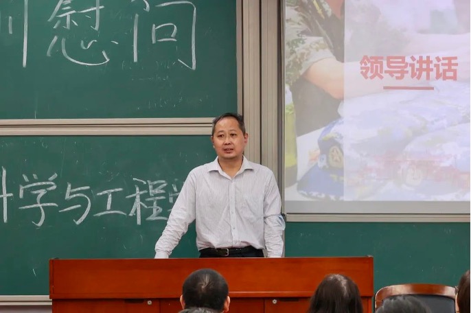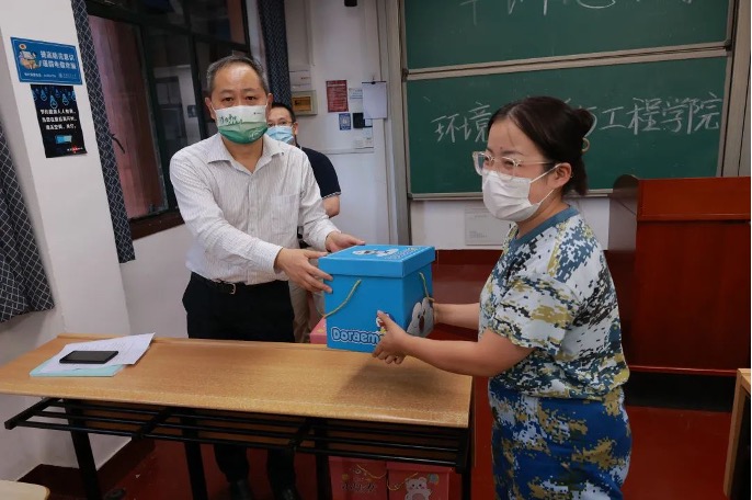 最后,学院领导为在座同学发放了环院定制的慰问礼包。本次慰问品由学院精心准备,除了丰富的零食大礼包,还为同学们准备了环境学院定制小风扇与院衫。
