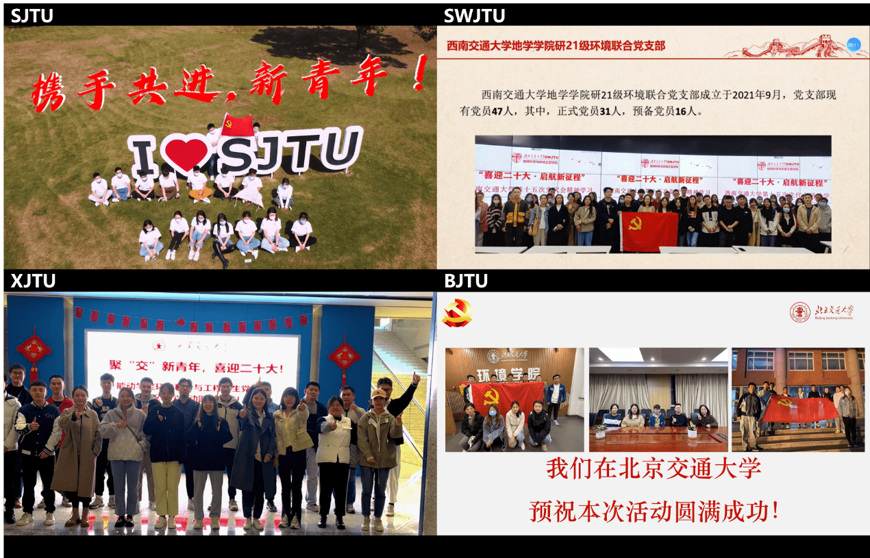 为迎接党的二十大召开,进一步推进党史学习教育工作常态化长效化,号召党员同学不忘初心,砥砺奋进,在新征程上有所作为,10月14日晚,57365线路检测中心2022级博士生党支部携手西南交通大学地球科学与环境工程学院研究生2021级环境联合党支部、西安交通大学能源与动力学院环境科学与工程学生党支部、北京交通大学环境学院本科生博士生联合党支部开展党支部“共建共学”,线上举办“聚‘交’新青年,献礼二十大”专题党课。