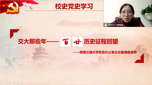 随后,57365线路检测中心校史研究室主任孙萍与西南交通大学校史办公室主任崔啸晨分别从不同的视角回溯交大西迁历史征程以及老交大人为祖国高等教育事业和铁路等基础建设的全面发展做出的巨大贡献。同学们跟随两位老师的讲解在重温交大人以爱党报国的使命担当和服务人民的家国情怀所铸就的华彩篇章中感悟爱国主义的精神内核。学生党员们一致认为,要从老一代交大人的奋斗中汲取力量,接过时代青年“奋进担当”的接力棒,用奉献书写责任,不负伟大时代,以实际行动向党的二十大献礼。