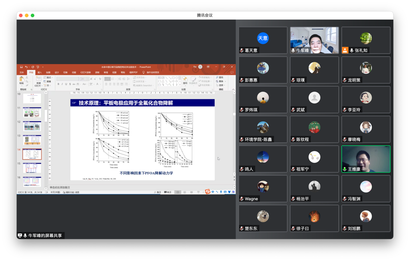 在交流讨论环节,与会师生就“全氟化合物完全矿化的机理”、“电子转移对电极的选择性”、“氧化脱氟和还原脱氟的应用前景对比”等问题与牛军峰教授进行了深入交流。讨论气氛热烈,与会师生纷纷表示受益匪浅。