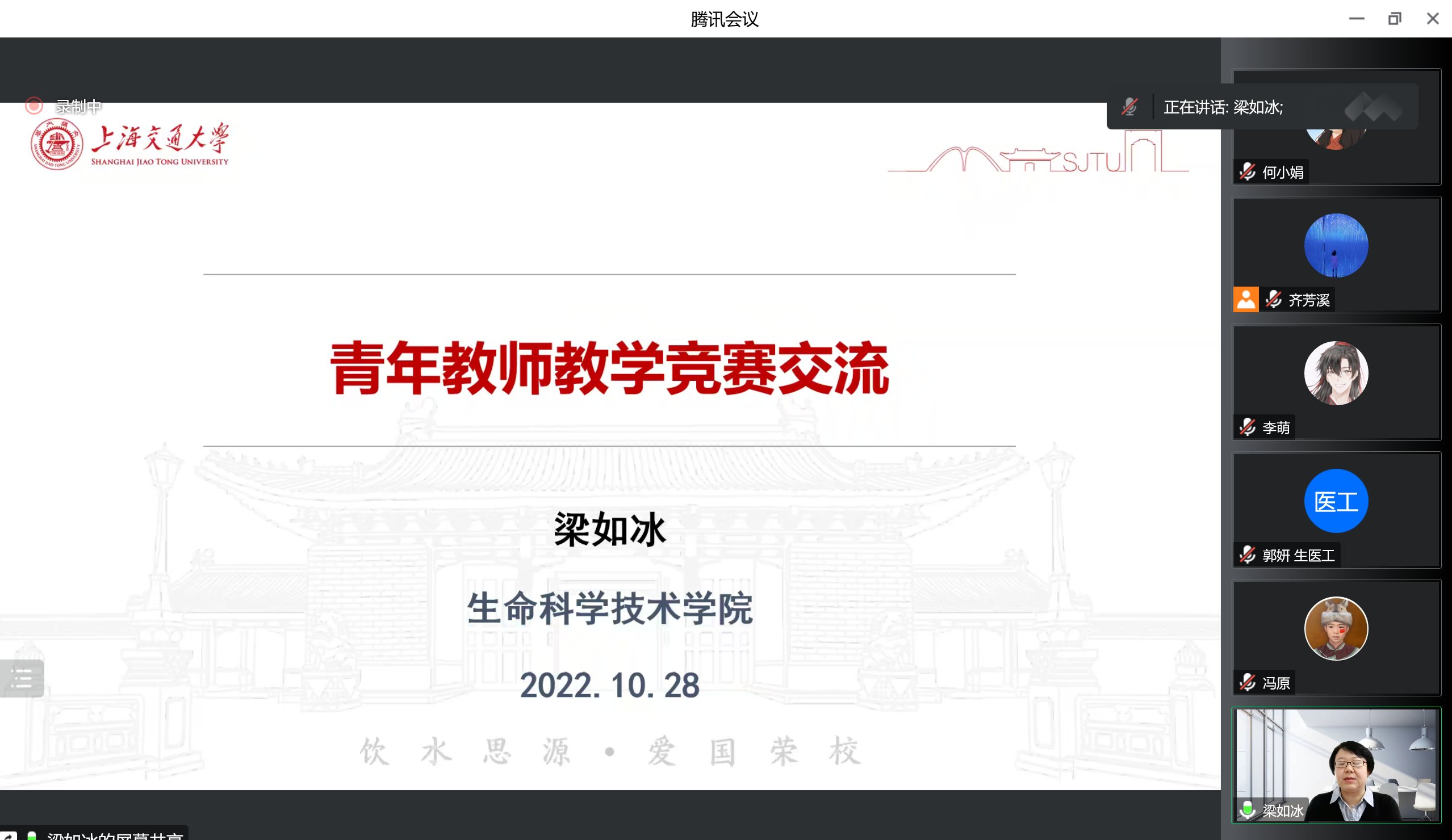 10月28日下午,生医工、环境、材料三院联合举办的“yl7703永利第七届青年教师教学竞赛赛事解读和教学经验分享会”以在线的形式成功举办。教学发展中心副主任张瑞对青教赛赛事进行了详细解读,生命科学技术学院梁如冰和电子信息与电气工程学院田晓华分别作了参赛经验分享。生物医学工程学院副院长白景峰、yl7703永利副院长刘萍和材料科学与工程学院副院长朱申敏参加本次活动并致辞。来自生医工、环境、材料三个学院40余名青年教师在线上参加了此次活动,会议由生医工郭妍老师主持。