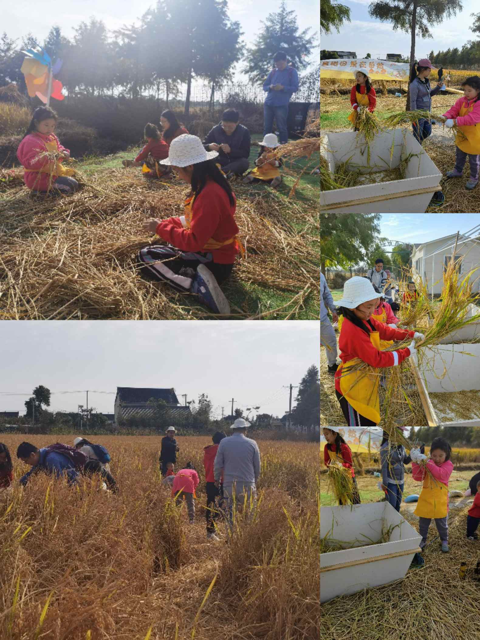 在收割现场,工作人员给小朋友演示了如何使用镰刀,在认真听讲注意事项后,一片热火朝天的收割场面随即展开。金灿灿的稻田里,活跃着家长忙碌的身影,传来了孩子悦耳的笑声。收割之后,小朋友们还体验了传统的打谷作业,观看脱粒演示,亲手扎起了稻草人。