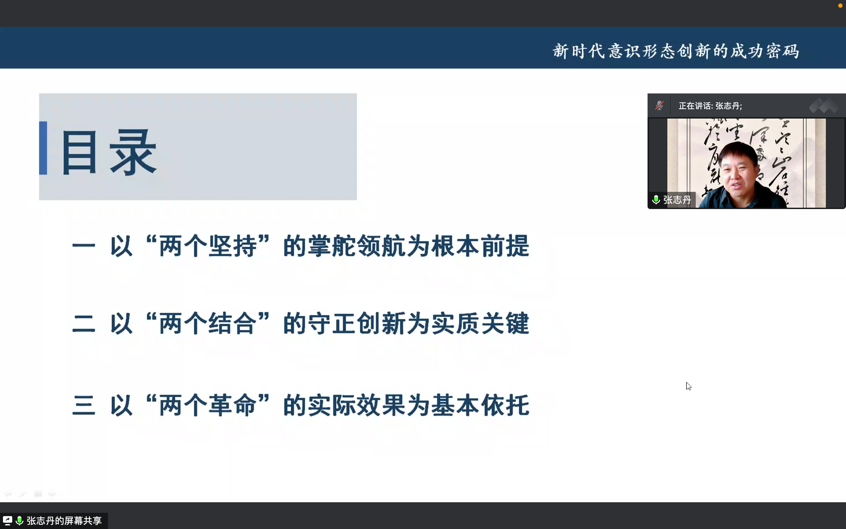 张志丹作题为“新时代意识形态创新的成功密码”的报告。他从以“两个坚持”的掌舵领航为根本前提、以“两个结合”的守正创新为实质关键、以“两个革命”的实际效果为基本依托等方面展开详细解读。他指出,党的二十大是在我国迈上全面建设社会主义现代化国家新征程、向第二个百年奋斗目标进军的关键时刻召开的一次十分重要的大会,党的二十大报告总揽全局、举旗定向,为推进中华民族伟大复兴注入强大动力和必胜信心。他强调,理论的生命力在于不断创新,创新的“实质”就是继承发展、守正创新,面对新时代新征程,面对“两个大局”,我们永远要有“逢山开路、遇河架桥”的精神,引领中华民族伟大复兴不可逆转地步入新境界。