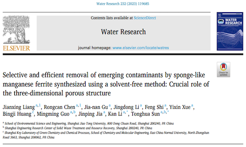 近日,yl7703永利贾金平团队在环境领域著名学术期刊Water Research上发表了题为“Selective and efficient removal of emerging contaminants by sponge-like manganese ferrite synthesized using a solvent-free method: Crucial role of the three-dimensional porous structure”的研究论文。