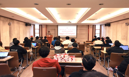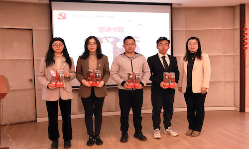 学院党委书记胡薇薇向毕业生党员赠送书籍。希望毕业生党员学习习近平同志热爱读书、博览群书的优秀品质,不断提升自我,不负时代,不负韶华,努力成长为优秀共产党员,以青春之我贡献青春之力量。