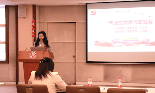 2018级博士毕业生党员庄沐凡以《不负韶华,青春向党》为题,回顾了9年来在交大求学的历程,表达了对母院悉心培养的感恩之情。她表示要坚定理想信念,坚持务实创新、脚踏实地,练就过硬本领,用实干之精神,锤炼责任与担当,发挥当代青年的光和热,让青春在奋斗中闪耀光芒,让“饮水思源,爱国荣校”的校训在环院青年身上传承发扬,为建设美丽中国接续奋斗,勇毅前行。