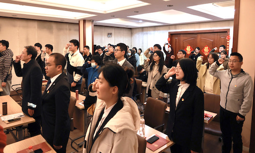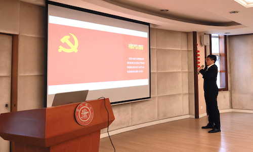 在重温入党誓词环节,由2018级博士生党员纪蕾朋领誓,现场全体党员庄严宣誓,表达了对党最坚定的信念和忠诚,坚定了全心全意为人民服务的决心。