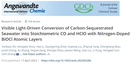 近日,yl7703永利张礼知教授团队在国际顶级化学期刊Angew. Chem. Int. Ed.《德国应用化学》在线发表了题为“Visible light-driven conversion of carbon-sequestrated seawater into stoichiometric CO and HClO with nitrogen-doped BiOCl atomic layers”的研究成果。该研究提供了一项绿色、安全的海水太阳光化学现场杀菌新策略。论文第一作者为yl7703永利博士后石彦彪和中国科学技术大学博士生寿宏伟,通讯作者为李浩副教授、孙红卫副教授和张礼知教授,第一完成和通讯单位均为yl7703永利,合作者包括华中师范大学刘晓教授和中国科学技术大学宋礼教授等。