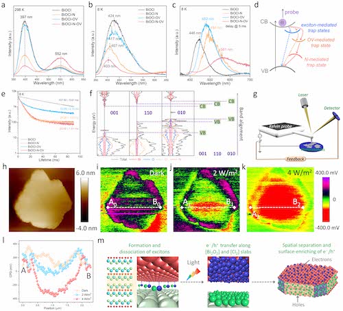 室温荧光、低温荧光、低温磷光表明BiOCl-N-OV原子层的N-OV缔合结构能促进激子解离产生自由载流子,从而延长光生载流子寿命。进一步DFT模拟结果表明,BiOCl-N-OV原子层高效的激子解离产生载流子过程可归功于N-OV缔合结构在其能带结构诱发的局域能量无序化,从而削弱激子稳定性并减小激子结合能。空间分辨KPFM测试结果表明,光生电子在内电场驱动下优先迁移至(001)晶面,而h+则转移至侧面(110)和(010)晶面。