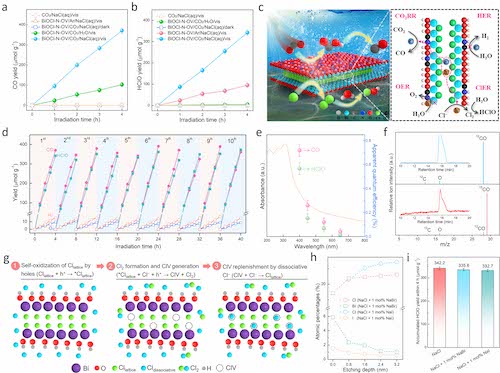 活性测试结果表明,BiOCl-N-OV原子层能够在CO2饱和模拟海水(0.5 mol L-1 NaCl)中持续高效合成CO和HClO。13CO2同位素标记证明了BiOCl-N-OV原子层光催化产生的CO源自于反应体系中通入的CO2;卤素交换实验说明溶液中Cl-可在BiOCl晶格氯位点处通过类Mars-van Krevelen机制光化学合成HClO。