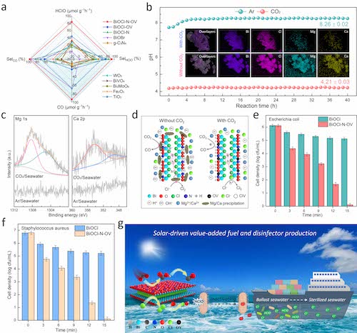 以实际海水为例,研究发现BiOCl-N-OV原子层与其它常见可见光催化剂相比具有更高的产物活性和选择性。特别地,在40 h连续反应中,实际海水中封存的CO2能维持溶液pH在4.2,从而避免海水中碱土金属离子在光催化剂表面沉积,确保了催化剂在实际海水中可适用性;且产生的HClO能够有效灭活压载水中典型细菌。