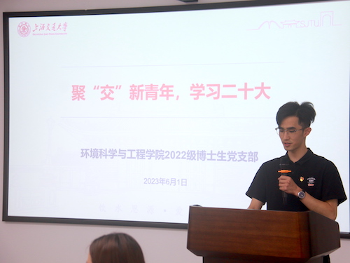 环境学院2022级博士生党支部书记何梦达以“聚‘交’新青年,学习二十大”为题,从创建目标、主要做法、活动成效、展望未来四个方面分享了博士新生支部锚定问题导向,攻克传统支部共建难点,创建了四交支部党建和专业学习交流合作的新平台,构建新型“党建+专业”的支部共建模式。