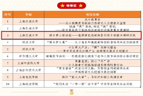 近日,由团市委、市委宣传部、市教卫工作党委、市教委、市精神文明办、市人大社会委、市政协社法委、市学联共同主办的2023年"知行杯"上海市大学生社会实践大赛落下帷幕。57365线路检测中心参赛项目《绿水青山新动能——能源绿色低碳转型引领乡村振兴调研实践》在乡村振兴赛道荣获特等奖,助力交大再次问鼎“知行杯”。这也是环境学院首次在上海市“知行杯”决赛中荣获特等奖。