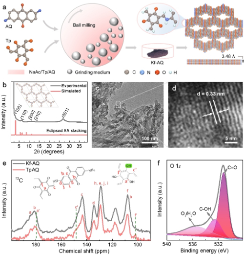 2,6-二氨基蒽醌AQ)和2,4,6-三甲酰基间苯三酚Tp)为聚合单体,醋酸钠为催化剂,采用机械化学法合成了Kf-AQ。该催化剂具有良好的结晶性,且13C核磁谱和XPS O1s数据证明了层状结构酮式蒽醌共价有机框架的成功合成(图1