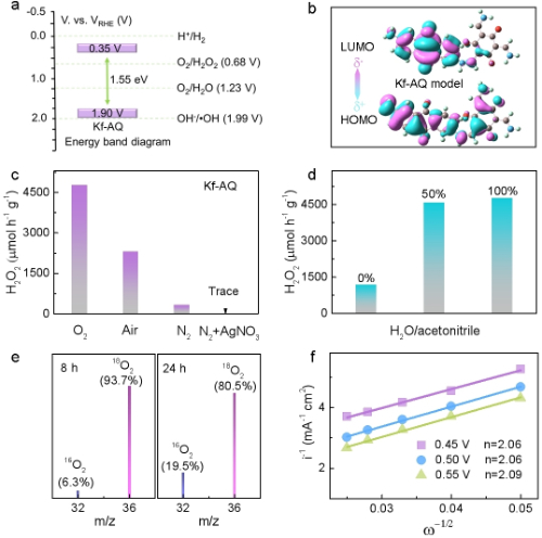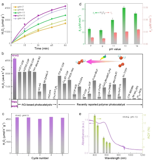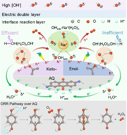 在可见光照射下,Kf-AQ表面产生电子-空穴对,其中电子通过C-N桥转移电子受体蒽醌基团AQ),而空穴则转移到酮基结构,实现电子空穴空间分离。酮吸附的团簇OH-(H2O)n被空穴氧化释放质子,并进一步被AQ上的电子还原形成活性氢H*ads),H*ads将蒽醌转化为氢醌,后者与氧气结合生成H2O2