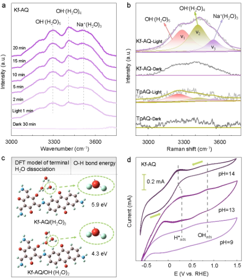 pH=13时,Kf-AQ表面吸附了不同结构水团簇(OH-(H2O)n酮式结构有助于水团簇的吸附,OH-离解结构进一步降低水分子摘氢能垒,加速水中和双氧水合成。Kf-AQCV曲线显示水解离形成活性氢进一步确认酮式蒽醌结构促进水氧化摘氢