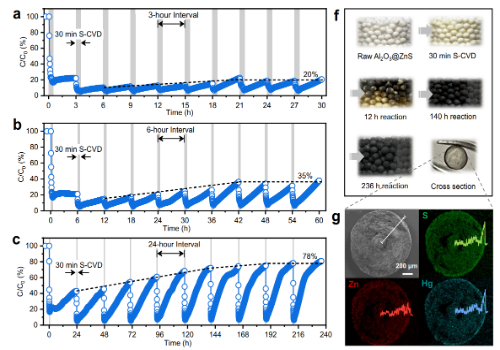 通过原位S-CVD策略,Al2O3@MS吸附剂不仅逆转了SO2的负作用,且其Hg0吸附容量为303.9 mg g–1(10轮自持活化),达到了现有炭基、氧化物基和硫基吸附剂平均吸附容量的250倍、60倍和8倍以上。并且,基于所提出的自持活化机制,Sd0和Hg0可在脱汞产物HgS上持续进行链式的沉积和吸附,理论上可突破Hg0吸附容量的限制。
