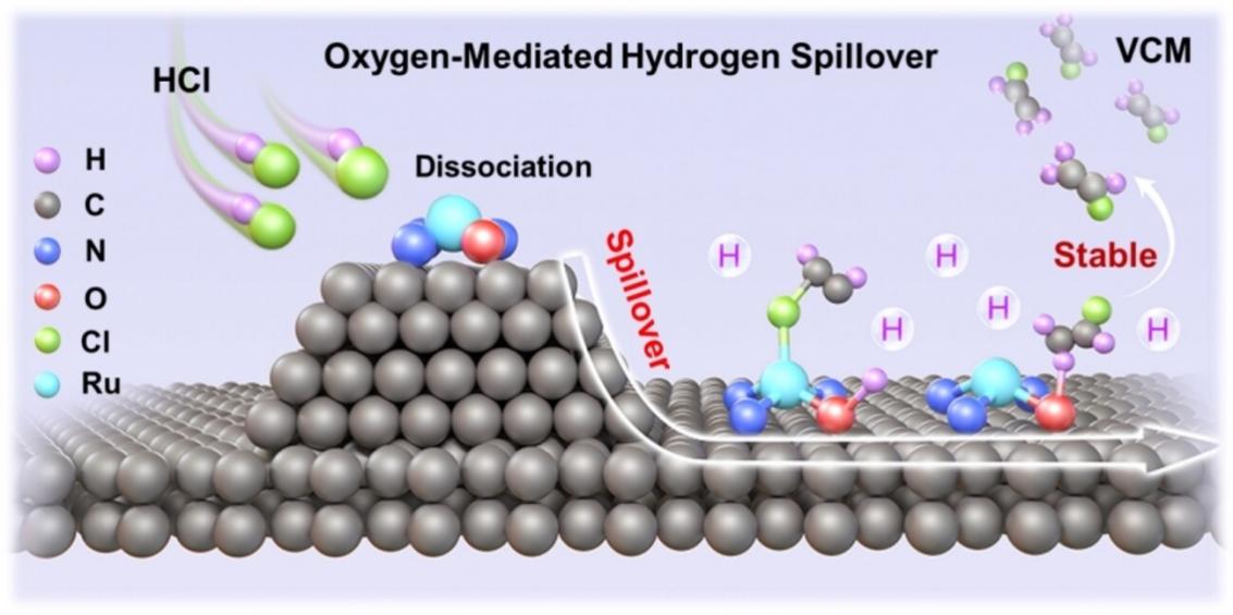 本研究通过氧蚀刻策略合成了固定在碳基质中的O/N共掺杂Ru SACs,该催化剂在合成氯乙烯方面表现出色,氯乙烯单体产率(>99.38%)和稳定性(> 900 h),相近条件下的性能远超过已报道的其它Ru基催化剂和商用含汞催化剂。实验结果和理论计算显示,单原子Ru的不对称结构在HCl活化后促进了非传统的氧介导的氢溢流,从而使反应通过E-R机制进行,与传统的L-H途径相比,降低了乙炔氢氯化的能垒。因此,反应动力学的增强进一步限制了单原子Ru的过度氯化,从而确保了卓越的耐久性。该项研究为设计具有更高性能的多功能乙炔氢氯化催化剂提供了一种策略。