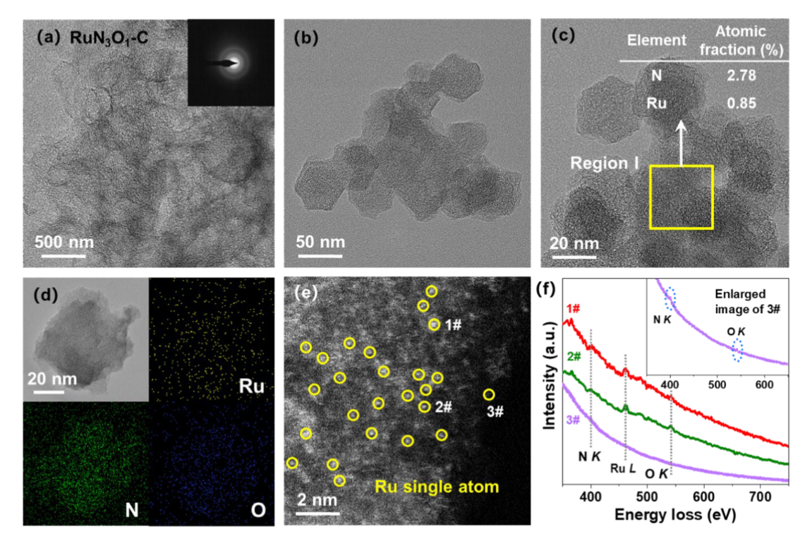 通过氧蚀刻策略合O/N共掺杂的Ru单原子催化剂,以调控其局部配位环境并提升催化性能。通过TEMAC-HAADF-STEM图像揭示了催化剂的微观形貌和原子级分散的钌。核心结果表明,RuN3O1-C由随机堆叠的不规则六边形纳米片组成,且钌原子均匀分散在碳基底上,未形成金属纳米颗粒。此外,EDSEELS分析进一步确认了RuNO元素的均匀分布以及RuNO的配位关系。这些结果为研究结论提供了重要支撑,证明了氧掺杂成功调控了钌的配位环境,为后续优异的催化性能奠定了基础。