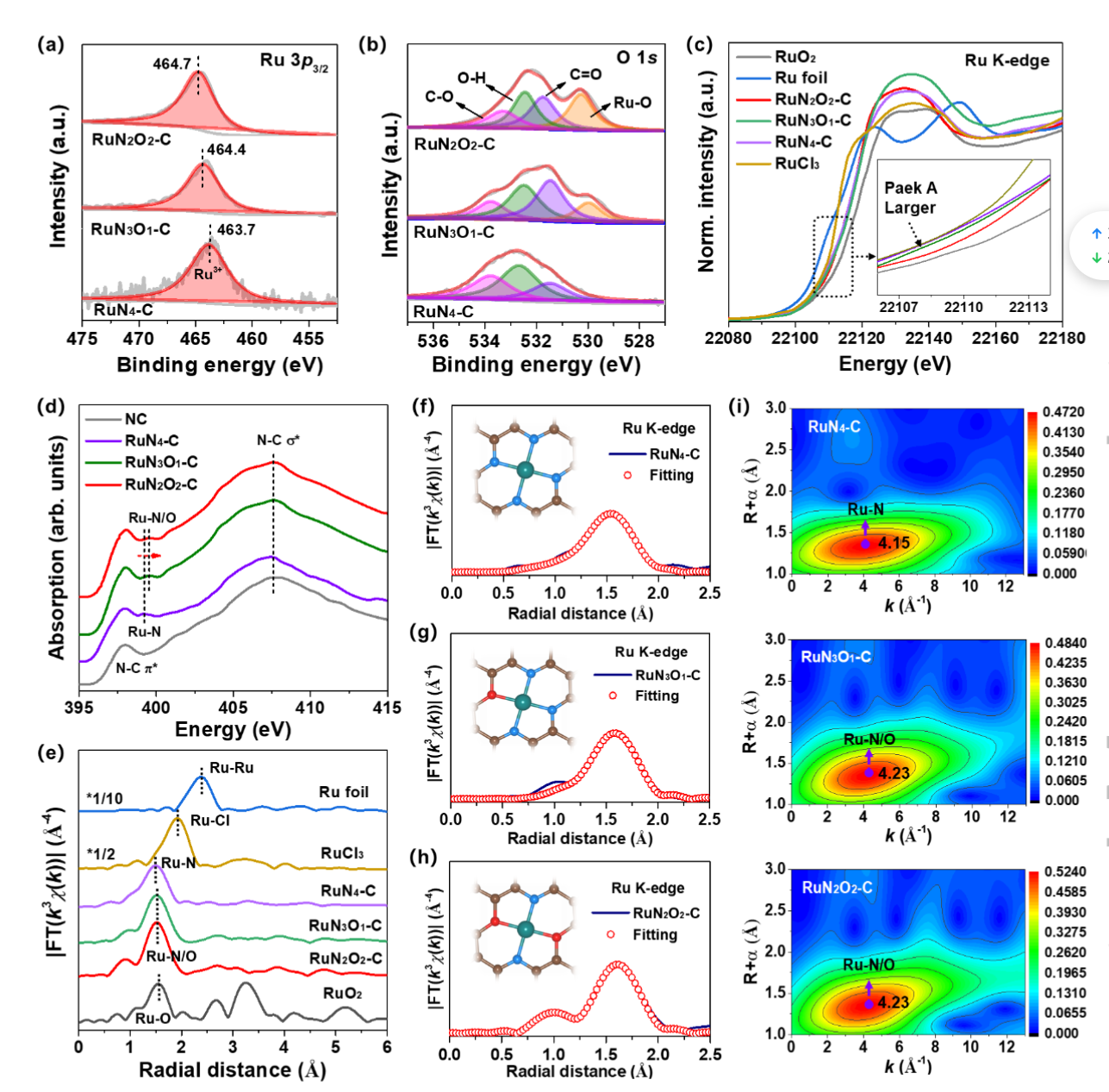 通过多种光谱技术揭示氧掺杂对钌单原子催化剂电子结构和配位环境的影响。核心数据包括XPSXAS结果。XPS分析显示,氧掺杂使钌的价态升高,表明氧从钌轨道抽取电子,增强了钌的氧化态。XAS进一步揭示了氧掺杂后钌的局域对称性变化,表明RuN3O1-C具有非中心对称的电子分布。此外,EXAFS分析确认了RuNO的双配位结构。这些结果对研究结论至关重要,证明了氧掺杂不仅改变了钌的电子结构,还优化了其配位环境,从而提升了催化性能。