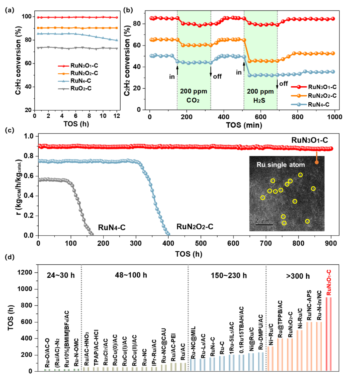 RuN3O1-C在反应中表现出超过99.4%的乙炔转化率和超过900小时的稳定运行时间,显著优于其他对照催化剂。此外,催化剂在含有杂质气体(如CO2H2S)的条件下仍能保持活性,表现出优异的抗中毒能力。这些结果直接证明了氧掺杂策略的成功,为开发高性能单原子催化剂提供了有力证据。