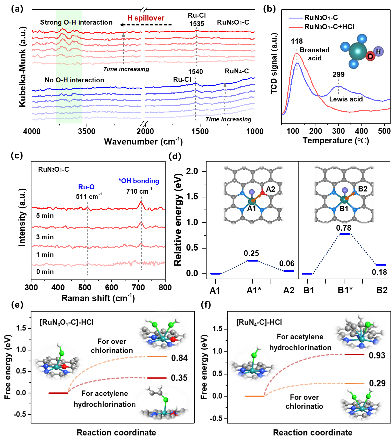 通过原位光谱技术和理论计算揭示氧掺杂如何通过氢溢流机制降低反应能垒。核心结果包括DRIFTSNH3-TPD实验,证实了氧掺杂催化剂中存在从钌到氧的氢溢流现象。此外,拉曼光谱分析进一步揭示了氢溢流过程中氧与氢的相互作用。理论计算表明,氢溢流显著降低了乙炔氢氯化的反应能垒,使其从传统的Langmuir-Hinshelwood机制转变为Eley-Rideal机制,并且氢溢流通过降低氯化反应的热力学驱动力来抑制过度氯化。这些结果对研究结论具有重要意义,揭示了氧掺杂催化剂优异性能的内在机制。