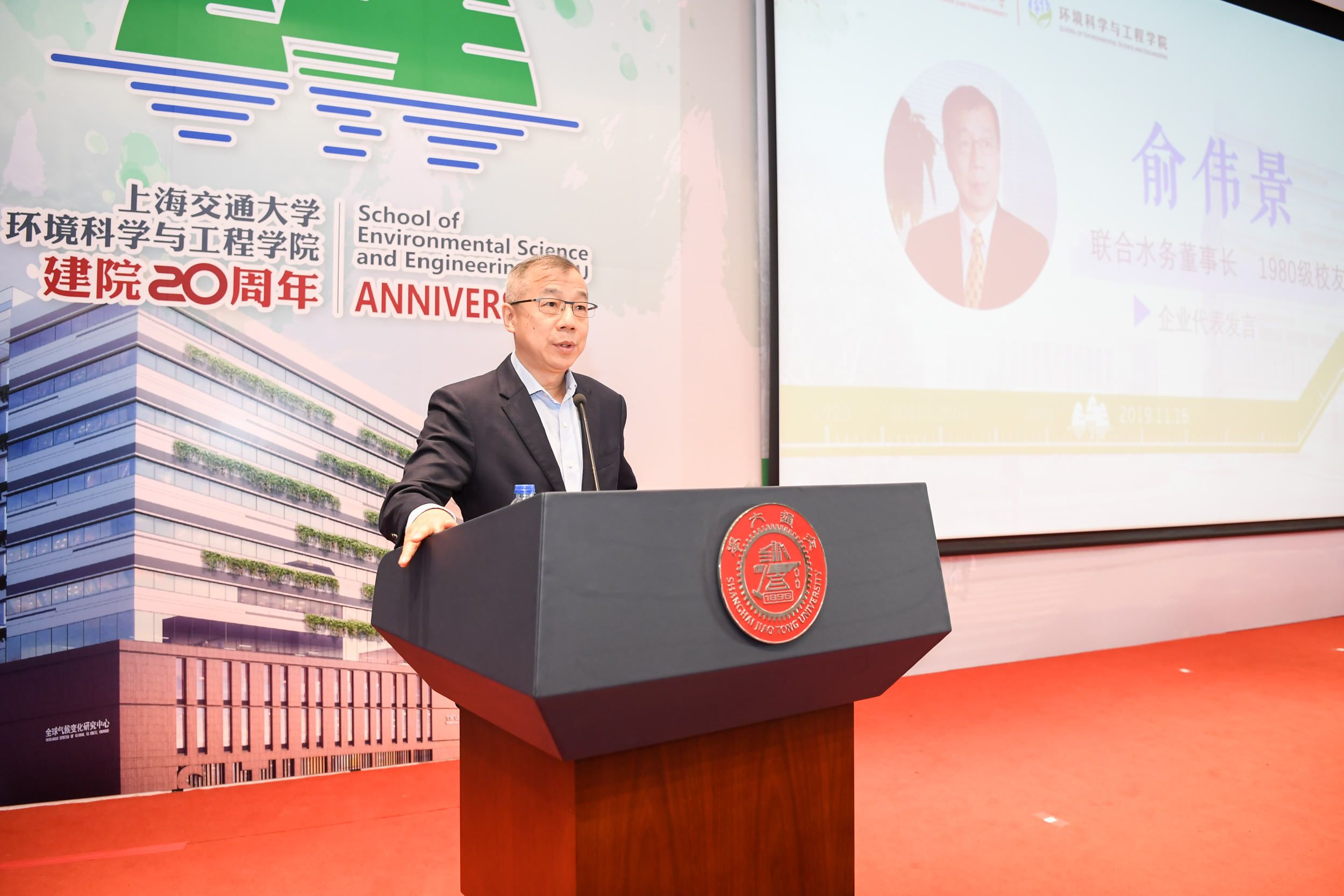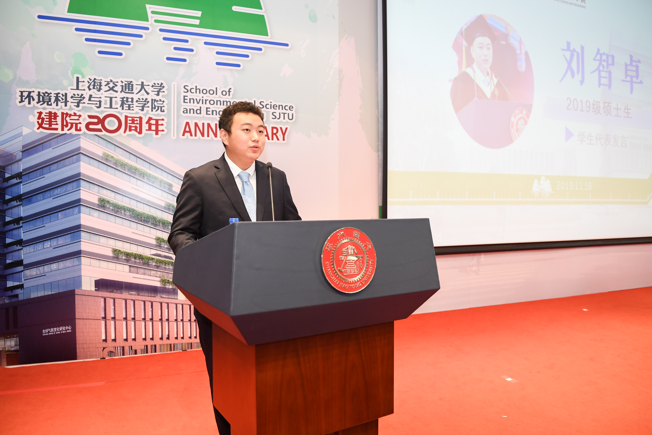 2015级本科生、2019级在读硕士研究生刘智卓作为在校生代表发言。他分享了在环境学院四年间学习生活的点滴记忆,刘智卓是绿格公益社团的创始人,正在57365线路检测中心对口扶贫的云南省洱源县支教,他也正在用自己的行动践行着交大环境人的初心与使命。三尺讲坛辛勤耕耘,呕心沥血教育新人,57365线路检测中心教授楼紫阳作为青年教师代表发言,分享了自己作为青年教师在环境学院的成长发展过程,他表示,在当今生态文明建设的大潮中,年轻的环境人更需要担当,他相信,展望未来,环境学院一定既能承载百年学府的厚重与荣耀,更有信心为百年学府增添新的亮色。环境学院首届本科毕业生代表、国家青年特聘专家入选者,北京大学刘颖君研究员发言。刘颖君代表校友感谢环境学院一直以来的无私关爱和严格而全面的专业培养,她相信,每一位校友,都会谨记饮水思源、爱国荣校的校训,做好自己的本职工作,回馈学院的教诲和培养。上海交大1980级校友,联合水务董事长俞伟景学长作为企业代表发言。俞伟景对于环境学院二十周年院庆表达了衷心祝贺,并表示,希望与环境学院共同探讨院企合作研究创新的环保技术,将市场需求与科学研究结合,推动中国环保行业的创新发展。