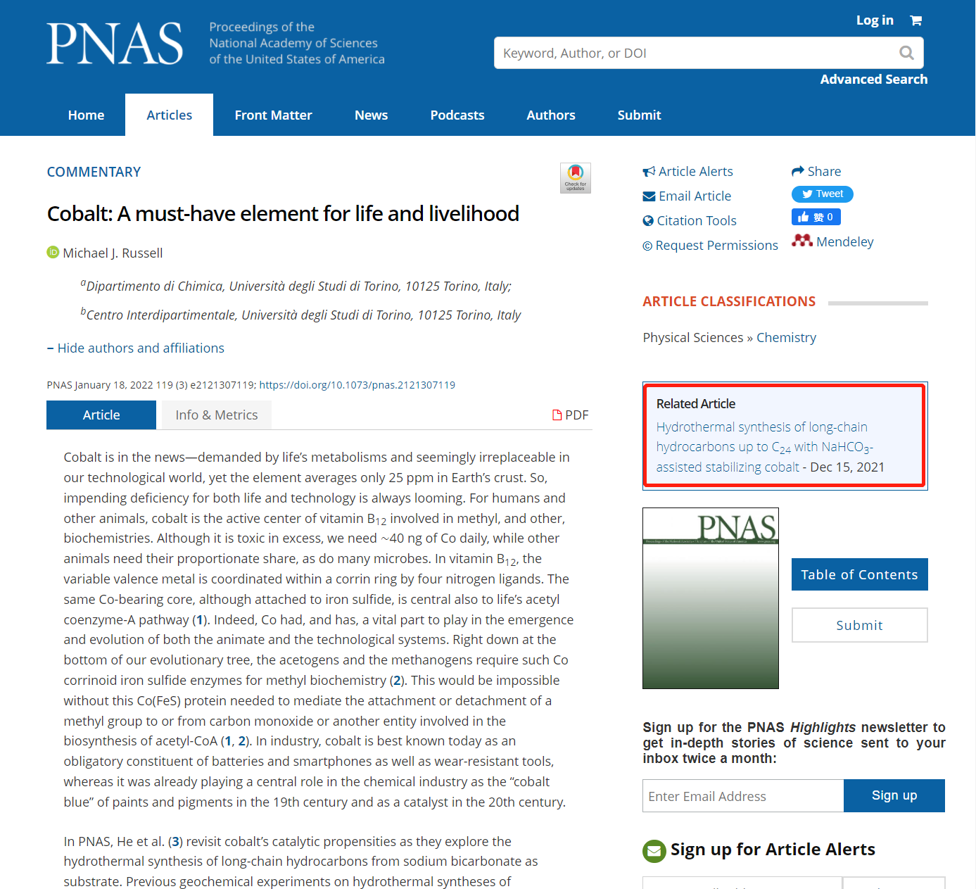 上月,yl7703永利金放鸣教授研究团队在《美国科学院院刊》(Proceedings of the National Academy of Sciences of the United States of America,PNAS)发表了水热转化二氧化碳产长链烷烃的论文,并被PNAS选为热点评述文章。近日,国际著名的海底生命起源学说创始人Michael J. Russell教授在PNAS对该研究发表了题为“Cobalt: A must-have element for life and livelihood”的重要专评文章(https://doi.org/10.1073/pnas.2121307119)。