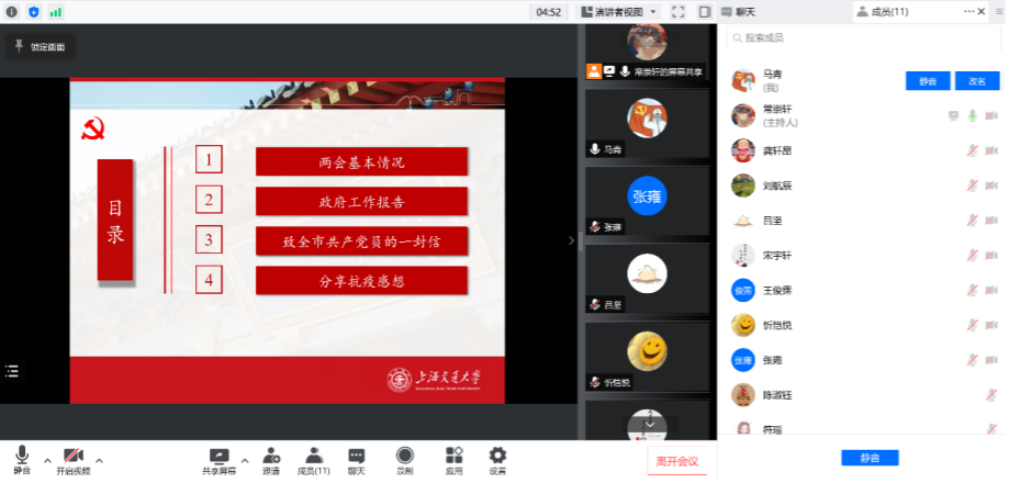 为深入学习贯彻2022年全国两会精神,进一步坚定抗疫必胜的信心,环境学院本科生党支部于3月30日下午开展“青春有我勇担当,同心战疫聚能量”线上主题党日活动。学院党委组织员马青列席会议。会议由本科生党支部书记常崇轩主持。