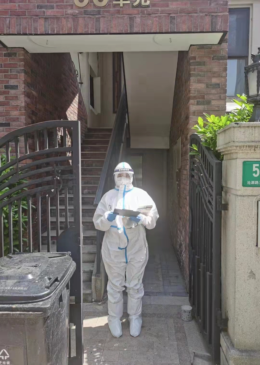 党员何小娟的爱人逆行支援交大,家中还有一老两小需要照顾。由于所在楼栋存在密接,她主动与居委沟通,协助做好居民安抚工作,积极传播正能量。空余时间还帮助发放政府物资、抗原检测盒,组织本楼栋居民有序排队检测核酸。她说:“每一位‘大白’都因心中有爱所以无畏无惧。这份爱在穿上防护服的那一刻就感受特别强烈,因为脚下的土地,就是我们要守护的家园。上海,加油!”