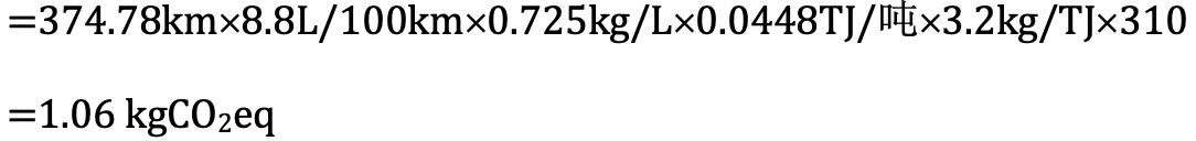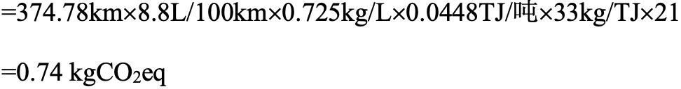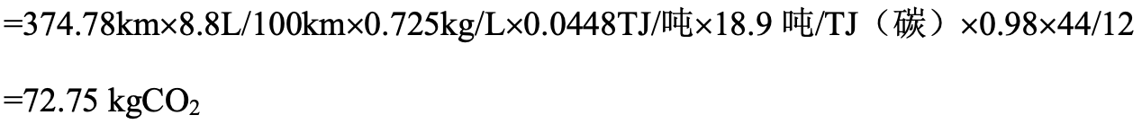 故,汽油车排放碳72.75kgCO2,温室气体排放量为:72.75+0.74+1.06=74.55 kgCO2eq。