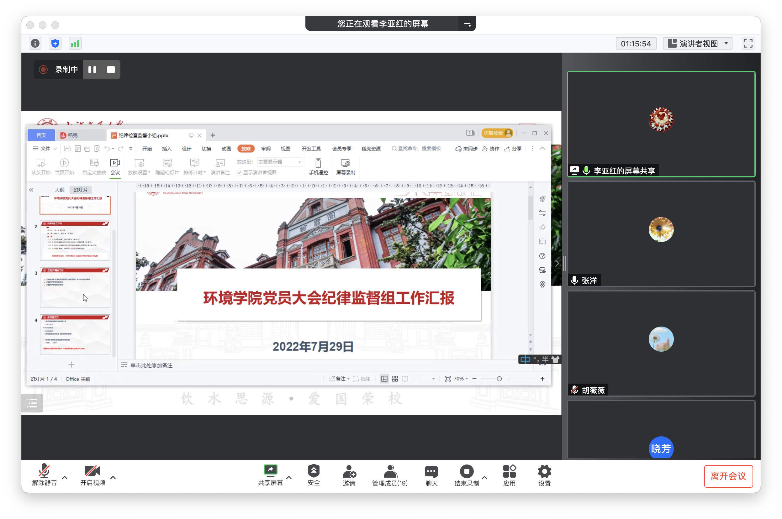 纪监组成员李亚红代表纪监工作组进行工作汇报,她指出,工作组成员认真贯彻动员部署会要求,积极组织学习相关纪律条例,下一步计划从配合学院党委做好纪监工作、向兄弟院系学习交流相关工作经验、推荐学习经典案例影像资料等三个方面推进工作,牢固树立纪律意识和规矩意识,坚决把纪律监督贯彻全程,为本次党员大会顺利召开提供坚强纪律保障。
