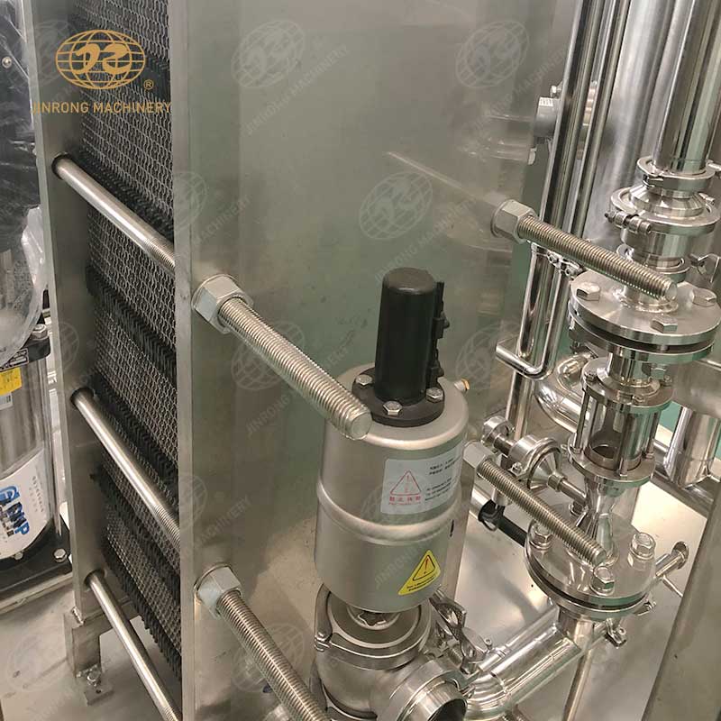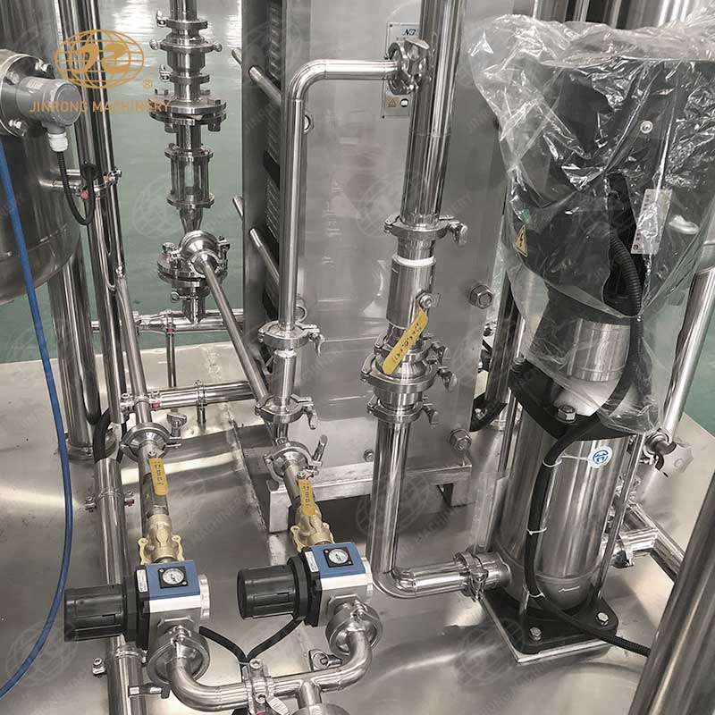 4. 混合机器采用板式换热器进行冷却。当饮料水和稀糖浆通过带刻度的手动调节阀进入混合罐时,混合泵升压后进入板式换热器,充分混合饮料水和稀糖浆。同时,利用板式换热器的固有特点,在另一侧加冰水,不仅可以混合饮料水和细糖浆,还可以降低温度,提高碳化效果。在进入之前,可以添加适当的二氧化碳,以获得更好的糖,水和天然气混合物。