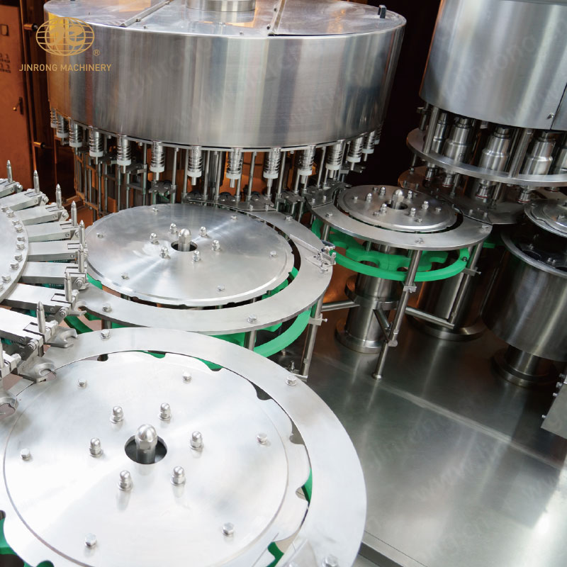 进入小瓶水加工生产设备的瓶子由瓶颈托板卡住并在凸轮作用下将瓶子上升,然后由瓶口将灌装阀顶开。灌装采用重力灌装方式。灌装阀打开后物料通过灌装阀完成灌装过程,灌装结束后瓶口下降离开灌装阀,瓶子通过卡瓶颈过渡拨轮进入旋盖机。
