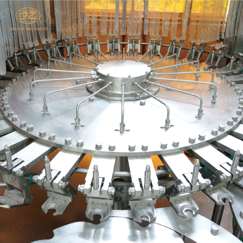 瓶子通过风送道传递,然后通过拨瓶星轮传送至三合一机的冲瓶机。回转盘上瓶夹夹住瓶口沿一导轨翻转180°,使瓶口向下。喷嘴喷冲瓶水,对瓶子内壁进行冲洗。瓶子经冲洗、沥干后在瓶夹夹持下沿导轨再翻转180°,使瓶口向上。洗净后的瓶子通过拨瓶星轮由冲瓶机导出并传送至灌装机。